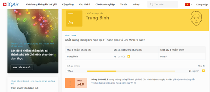 Theo trang “iqair.com”, nồng độ PM2.5 trong không khí tại Thành phố Hồ Chí Minh tính đến tháng 08/2022 cao gấp 4.8 lần giá trị theo hướng dẫn về chất lượng không khí hàng năm của WHO.